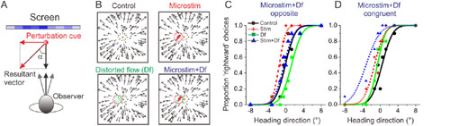 (A)局部物體運動干擾示意圖;在觀測者自身發生運動時(黑色箭頭),局部的物體被加入額外的(物體自身)運動的向量(紅色箭頭)后,在視網膜上呈現出的合成運動向量偏移原始方向向量α度(實驗中約6度)。(B-D)電刺激與局部向量干擾對行為的交互影響;(B)四種穿插在一次實驗中的實驗條件:對照(無電刺激和局部向量干擾,左上),電刺激(右上),變形的光流場(局部向量干擾,左下),同時給電刺激和局部向量干擾(右下);(C)當同時給電刺激和視覺向量干擾時,兩者產生的效應是反向的情況(紅:在有電刺激的條件下的心理物理曲線;綠:在給局部向量干擾時的心理物理曲線;藍:同時給電刺激和局部向量干擾)。(D)當同時給電刺激和視覺向量干擾時,兩者產生的效應是同向的情況。