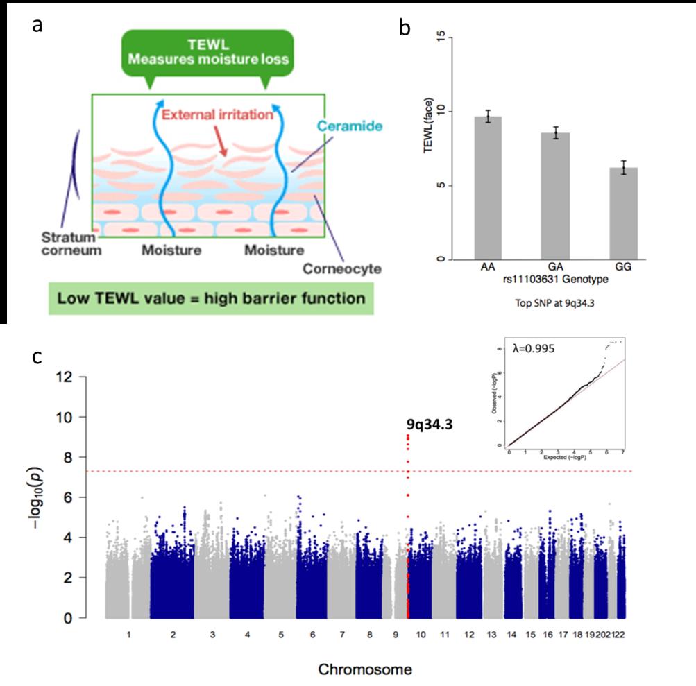 2016年12月21日,皮膚學頂級雜志Journal of Investigative Dermatology在線發(fā)表了中國科學院-馬普學會計算生物學伙伴研究所汪思佳研究組題為:“A genome-wide association study of basal transepidermal water loss (TEWL) finds variants at 9q34.3 to be associated with skin barrier function”的研究成果。經皮失水率(TEWL),指透過表皮丟失的水分量,是評價皮膚屏障功能的重要指標之一。該研究首次針對漢族健康人群的皮膚屏障功能,利用基礎經皮失水率值進行全基因組關聯分析,發(fā)現位于9號染色體9q34.3處的基因位點突變與TEWL密切相關,揭示影響東亞漢族群體皮膚屏障功能的遺傳因素。
