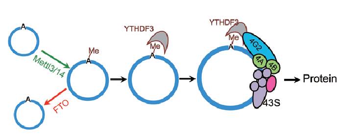 人的細胞中所有的已知mRNA都含有5’端帽結構,這一帽結構是大部分mRNA翻譯所必需的。然而在一些特殊情況如細胞應激條件下,有些 mRNA可以不依賴于帽結構而靠一個叫IRSE的順式調控原件來從mRNA的中間啟動翻譯。這種IRES驅動的蛋白翻譯在RNA病毒中很常見,但只在一小部分的真核細胞mRNA中發現。在王澤峰組的前期工作中,他們發現插有IRES的編碼GFP的環狀RNA可以在細胞中被翻譯。而新的工作中,他們發現環狀RNA中富含m6A甲基化修飾,而且這些堿基修飾可以像IRES一樣驅動環狀RNA翻譯。王澤峰研究員認為,“這兩個發現放在一起,就可推斷出有大量的環狀RNA被翻譯成蛋白質這一令人驚訝的結論,說明人的細胞中存在有大量的環狀RNA編碼的未知蛋白?!?這是一個有很令人興奮的結論,說明人類蛋白質的多樣性遠比從前想的大。