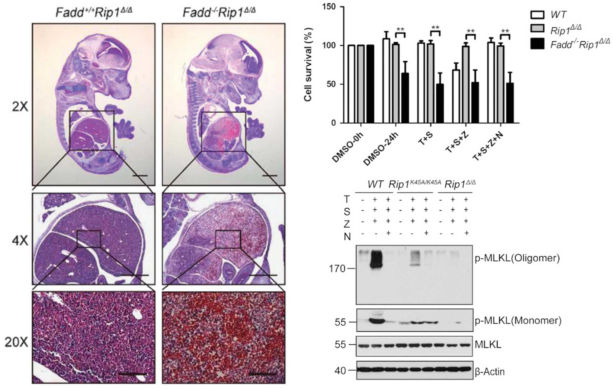 在章海兵研究員的指導下,博士研究生劉永波、范存先等通過構建RIP1激酶結構域不同關鍵位點突變的小鼠,發現激酶活性的缺失不影響成體小鼠的正常生存,但體內體外實驗均證實RIP1激酶活性的降低會特異性的阻斷細胞程序性壞死的發生。之前研究發現細胞凋亡基因FADD的缺失導致的胚胎致死是細胞程序性壞死依賴的,即RIP1、 RIP3或MLKL的敲除能夠挽救FADD敲除小鼠的胚胎發育致死。因此我們利用RIP1激酶結構域不同位點突變小鼠與FADD敲除小鼠交配,意外發現RIP1激酶結構域中不同關鍵位點的突變在抑制FADD敲除小鼠的胚胎致死及介導炎癥中的作用不同。進一步對其機制探究,發現RIP1激酶結構域中不同關鍵位點突變導致其激酶活性缺失程度不一致,從而導致了RIP3、MLKL的磷酸化及多聚化減弱而阻斷細胞程序性壞死的程度不同。此外,本研究還發現在FADD缺失條件下,RIP1激酶活性的降低還能誘導胚胎發育過程中過度炎癥的產生。RIP1的激酶活性小分子抑制劑Nec-1已經在包括神經退行性疾病等多種疾病的臨床研究階段,這一研究為進一步開發針對RIP1不同激酶活性位點的藥物提供理論依據及動物模型。