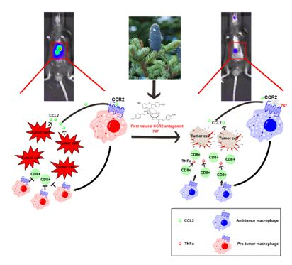 7月17日,《細(xì)胞》出版社和《柳葉刀》雜志聯(lián)合支持的EBioMedicine雜志在線發(fā)表了中國(guó)科學(xué)院上海生科院(人口健康領(lǐng)域)王慧研究組的研究論文“A Natural CCR2 Antagonist Relieves Tumor-associated Macrophage-mediated Immunosuppression to Produce a Therapeutic Effect for Liver Cancer”,該研究發(fā)現(xiàn)了一個(gè)提取自長(zhǎng)苞冷杉的天然CCR2拮抗劑(編號(hào)747),可通過(guò)解除腫瘤相關(guān)巨噬細(xì)胞引起的免疫抑制微環(huán)境來(lái)抑制肝癌,同時(shí)增敏低劑量索拉菲尼的治療效果。