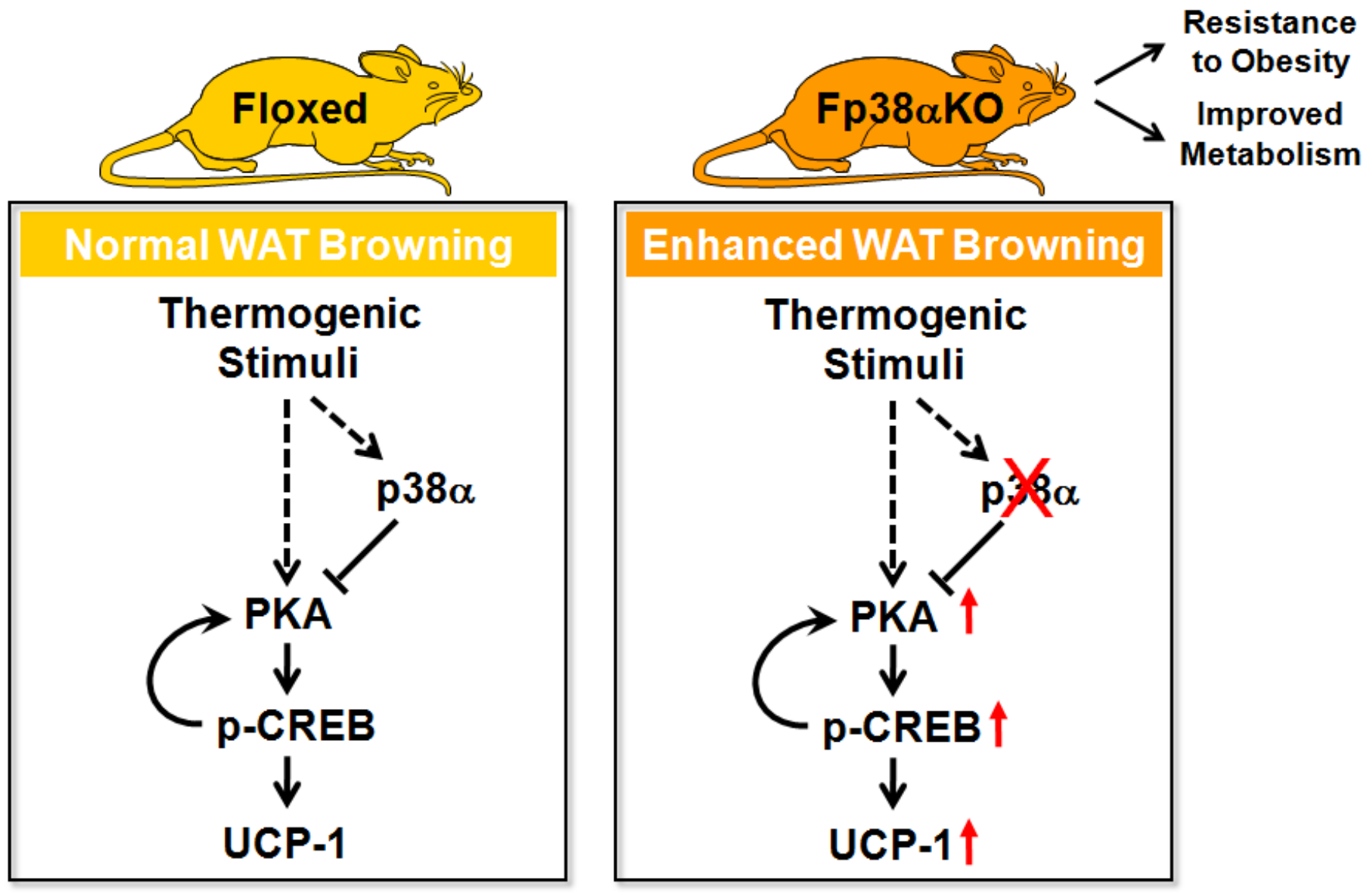在這項最新的研究中,博士研究生張圣潔等人在應浩研究員的指導下,發現脂肪組織特異敲除p38α后小鼠的體重減輕,但是體溫維持能力以及褐色脂肪產熱功能基本不受影響。而在低溫環境下,白色脂肪p38α缺失后能夠觀察到米色脂肪細胞比對照明顯增多,米色化活動加劇。在β腎上腺素受體激動劑CL316,243的刺激下,脂肪組織p38α缺失的小鼠能量消耗顯著增加。通過基因敲除小鼠和抑制劑定點注射兩種手段,發現p38α缺失或活性受損后能夠抵抗高脂飲食誘導的肥胖以及db/db小鼠體重的上升。通過一系列體外水平實驗,發現p38α缺失后在白色脂肪細胞中PKA以及CREB的活性同時上調,促進UCP1的轉錄表達,細胞的米色化進程加快,能量消耗增加。