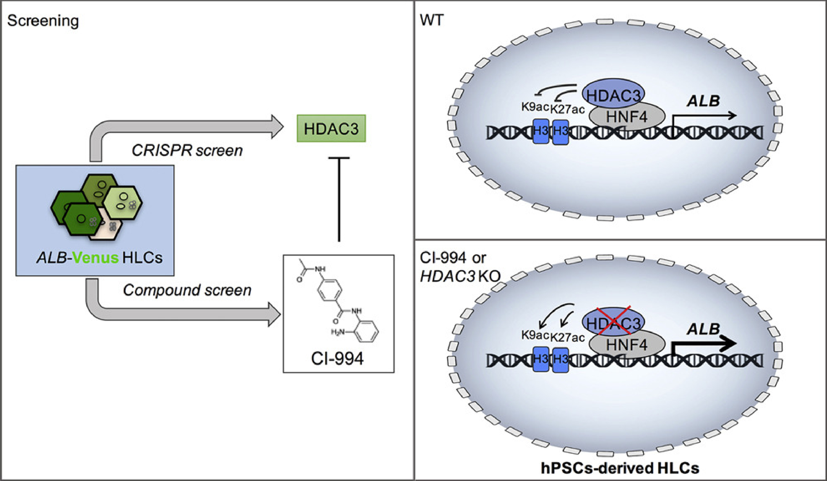 為進(jìn)一步優(yōu)化體外定向分化體系,促進(jìn)肝臟細(xì)胞的成熟和均一化,博士研究生李爽等人在肝臟成熟標(biāo)志物白蛋白(ALB)終止密碼子前定點(diǎn)敲入綠色熒光蛋白(Venus)表達(dá)框,建立了成熟肝臟譜系標(biāo)記的人多能干細(xì)胞報(bào)告株。并在此基礎(chǔ)上,運(yùn)用CRISPR全基因組敲除慢病毒文庫,進(jìn)行了大規(guī)模遺傳篩選,鑒定出ATG7, RPS6KA2, HDAC3等若干基因參與調(diào)節(jié)人多能干細(xì)胞體外肝向分化。同時(shí)根據(jù)篩選出的調(diào)節(jié)基因及其相關(guān)功能提示,進(jìn)一步進(jìn)行了有針對性的化合物文庫篩選,發(fā)現(xiàn)一個(gè)組蛋白去乙酰化酶小分子抑制劑CI-994能顯著促進(jìn)HLCs的定向分化;并發(fā)現(xiàn)該小分子同樣能抑制原代肝臟細(xì)胞體外培養(yǎng)過程中肝臟屬性的快速丟失。全基因組敲除慢病毒文庫篩選和小分子化合物庫篩選都證實(shí)了組蛋白去乙酰化酶HDAC3是肝臟分化的重要調(diào)控因子,進(jìn)一步的研究發(fā)現(xiàn)HDAC3可以與肝臟譜系關(guān)鍵轉(zhuǎn)錄因子HNF4等結(jié)合共同調(diào)節(jié)肝臟細(xì)胞分化過程。