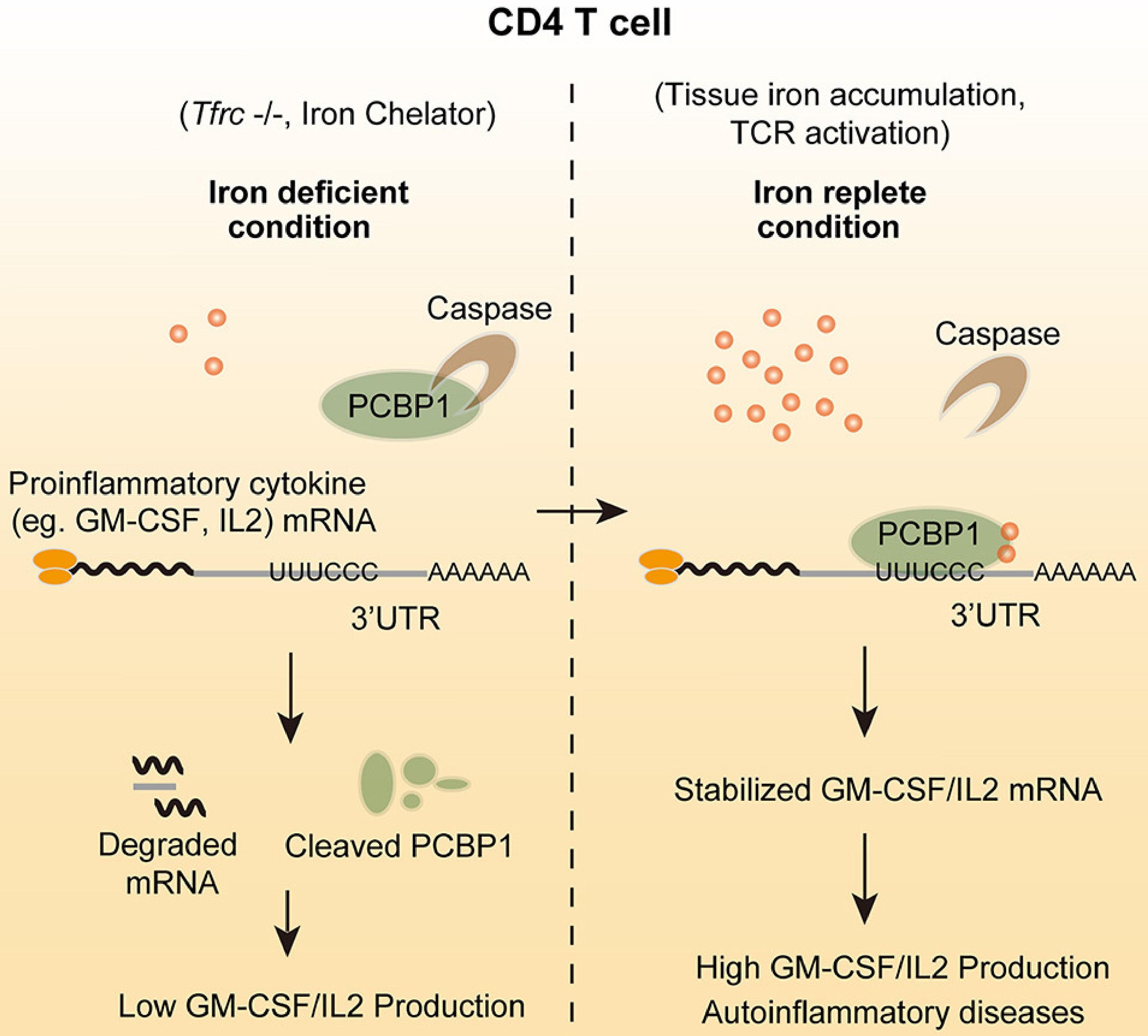 在輔助性T細胞中,胞內鐵離子充足時,PCBP1蛋白穩(wěn)定表達,GM-CSF等促炎性細胞因子mRNA半衰期延長,從而大量產生細胞因子;胞內鐵離子匱乏時,PCBP1被Caspase剪切降解,GM-CSF等促炎性細胞因子mRNA半衰期縮短,快速降解,從而使細胞因子產生受損。