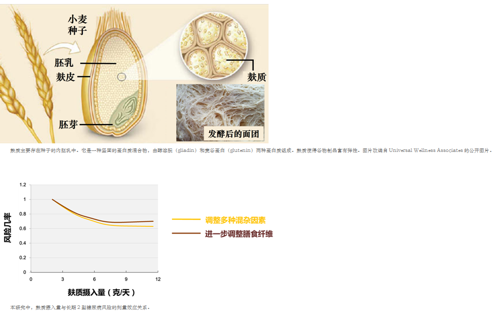 麩質是小麥、大麥和黑麥胚乳中的主要貯藏蛋白。中國人日常飲食中,所吃的“面筋”就是面粉經過反復水洗后剩余的麩質。在全世界范圍內,有少量人(約1%)對麩質過敏,導致自身免疫反應并引起乳糜瀉。在過去的幾年中,“無麩質飲食”在許多國家越來越受歡迎。大眾普遍認為攝入無麩質飲食有益于健康,特別是對控制體重有好處。但是這種觀點缺乏關于麩質攝入對人群健康影響的證據。一些小型干預研究報道高劑量的麩質攝入(60-100 g/day)對健康個體和血脂異常人群無明顯副作用,而每天攝入60-80g麩質可降低血脂、血壓,減少氧化應激。為了研究麩質攝入對健康的潛在影響,本研究檢驗了人群中典型麩質攝入量(2-12g/day)與2型糖尿病之間的關系。