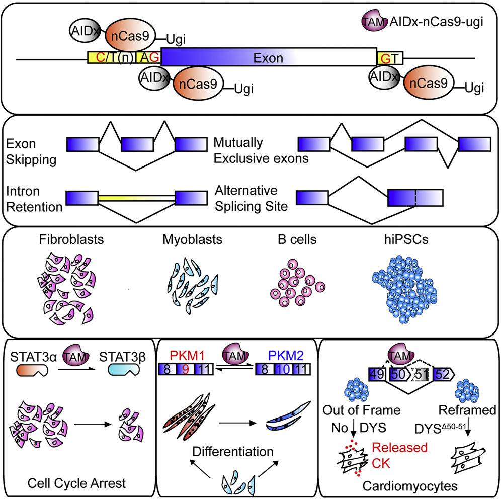 在這一新研究中,博士研究生袁娟娟和馬云青首先注意到,98%以上的內含子有保守的GU(內含子開始)和AG(內含子末尾)序列,推測如果可以高效精確的將G突變成A, 可以特異性阻斷外顯子識別,調控內源性mRNA的剪切。通過這一策略,利用TAM誘導剪接位點DNA上G>A突變,就可以誘導可變外顯子(alternative exon)及組成性外顯子(constitutive exon)的跳讀(Exon skipping);改變可變剪接位點的選擇(Alternative splice site);調節互斥外顯子的選擇(mutually exclusive exons);誘導小的內含子的包含(intron retention)。此外,如果通過TAM將3'剪接位點上游polypyrimidine track中包含的C向T突變,可以促進下游外顯子的包含。因此,利用TAM可以成功的實現針對RNA剪接的“loss of function”和”gain of function”調控。