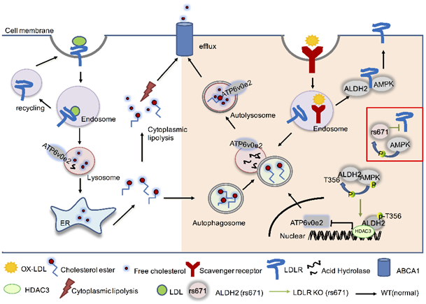 博士研究生仲珊珊等在尹慧勇研究員的指導(dǎo)下,發(fā)現(xiàn)與LDLR敲除的小鼠比,ALDH2和LDLR雙敲小鼠的動(dòng)脈粥樣硬化斑塊面積反而降低,其表型與ALDH2和ApoE雙敲的小鼠表型相反。進(jìn)一步的分子機(jī)制研究發(fā)現(xiàn)在巨噬細(xì)胞中AMPK磷酸化激活rs671位點(diǎn)突變的ALDH2使其從線粒體進(jìn)入細(xì)胞核和HDAC3蛋白結(jié)合,抑制調(diào)控溶酶體功能和細(xì)胞自噬的氫離子泵ATP6V0E2的表達(dá),抑制巨噬細(xì)胞對(duì)oxLDL水解從而造成其在巨噬細(xì)胞中的堆積,促進(jìn)泡沫細(xì)胞的形成;通常情況下LDLR與ALDH2蛋白相互作用阻斷這個(gè)過程,從而抑制泡沫細(xì)胞的形成。該研究發(fā)現(xiàn)了ALDH2調(diào)控泡沫細(xì)胞形成的新機(jī)制,解釋了ALDH2 rs671位點(diǎn)突變?nèi)巳盒难芗膊≡黾拥默F(xiàn)象,為動(dòng)脈粥樣硬化的治療提供了新的思路。