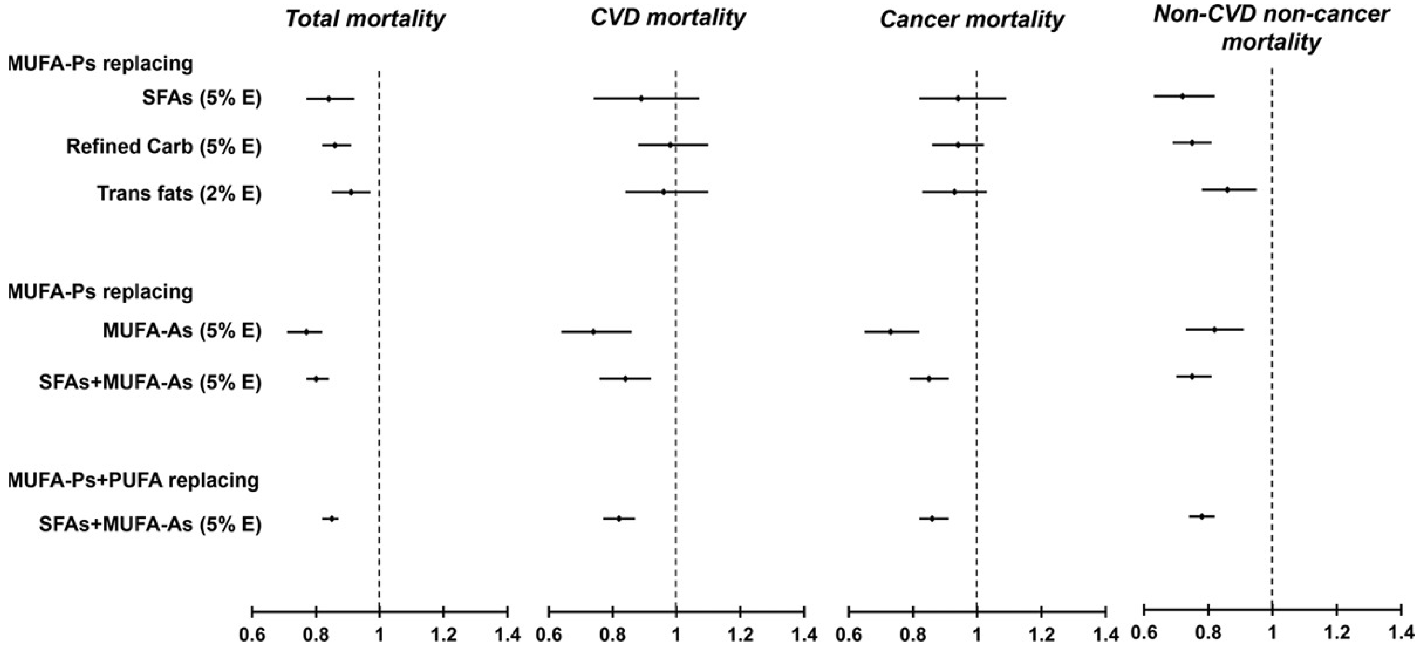 本研究納入了2個大規模的前瞻性研究隊列【護士健康研究(Nurses' Health Study)、健康醫護人員研究(Health Professionals Follow-up Study)】的近10萬名調查對象,研究人員根據每四年一次的飲食問卷(FFQ)和產期更新的食品成分數據庫評估調查對象的長期膳食狀況。在22年的隨訪期內,共發現死亡案例20,672例。通過統計分析,研究人員發現總MUFAs和MUFA-Ps與總死亡率呈負相關,而MUFA-As與總死亡率呈正相關。尤其值得引起注意的是,當植物來源的MUFA替換相同熱量(按每日總能量攝入的5%計算)的飽和脂肪酸時,總死亡率下降16%;替換精加工的碳水化合物時,總死亡率下降14%;替換動物來源的MUFA時,總死亡率下降23%,心血管疾病死亡率下降26%,癌癥死亡率下降27%,其它死亡率下降18%(下圖)。