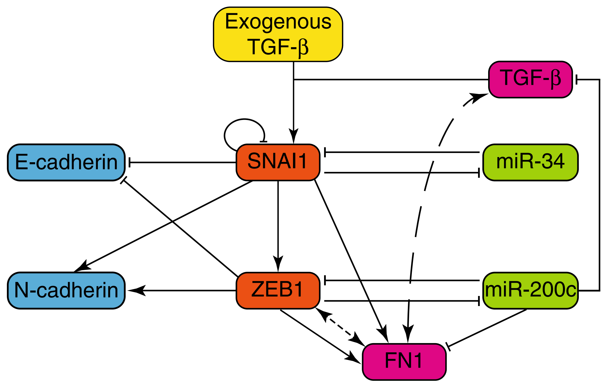 圖:動態(tài)誘導(dǎo)的競爭性內(nèi)源RNA調(diào)控上皮間質(zhì)轉(zhuǎn)化示意圖