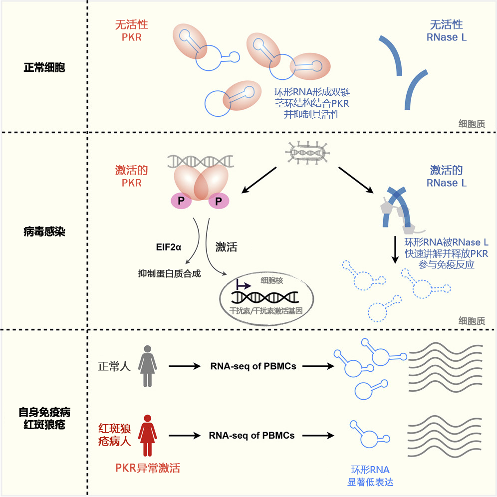 在這項最新的研究進展中,科研人員構建了針對環形或線形RNA二級結構的實驗和計算體系,通過對比發現環形RNA,而不是線形RNA,可以普遍形成16-26 bp的雙鏈RNA莖環結構;更為重要的是,環形RNA通過其特征的雙鏈RNA莖環結構可以特異地與天然免疫因子PKR結合;在正常細胞狀態下,環形RNA通過結合PKR并抑制其活性,避免了PKR過度激活引起免疫反應;而當細胞被病毒感染時,環形RNA可通過被RNase L快速降解進而釋放PKR參與細胞的抗病毒免疫過程。進一步通過對免疫性疾病-系統性紅斑狼瘡病人來源的外周血單核細胞分析表明,在紅斑狼瘡病人體內環形RNA普遍低表達且PKR異常激活;而增加環形RNA的表達則可以顯著抑制病人來源外周血單核細胞和T細胞中的PKR及其下游免疫信號通路的過度激活。這一最新研究進展不僅首次回答了關于環形RNA降解、二級結構特征和特殊生物學功能等一系列基礎科學問題,也為紅斑狼瘡等自身免疫病的臨床診斷和治療等應用研究提供了新基礎。