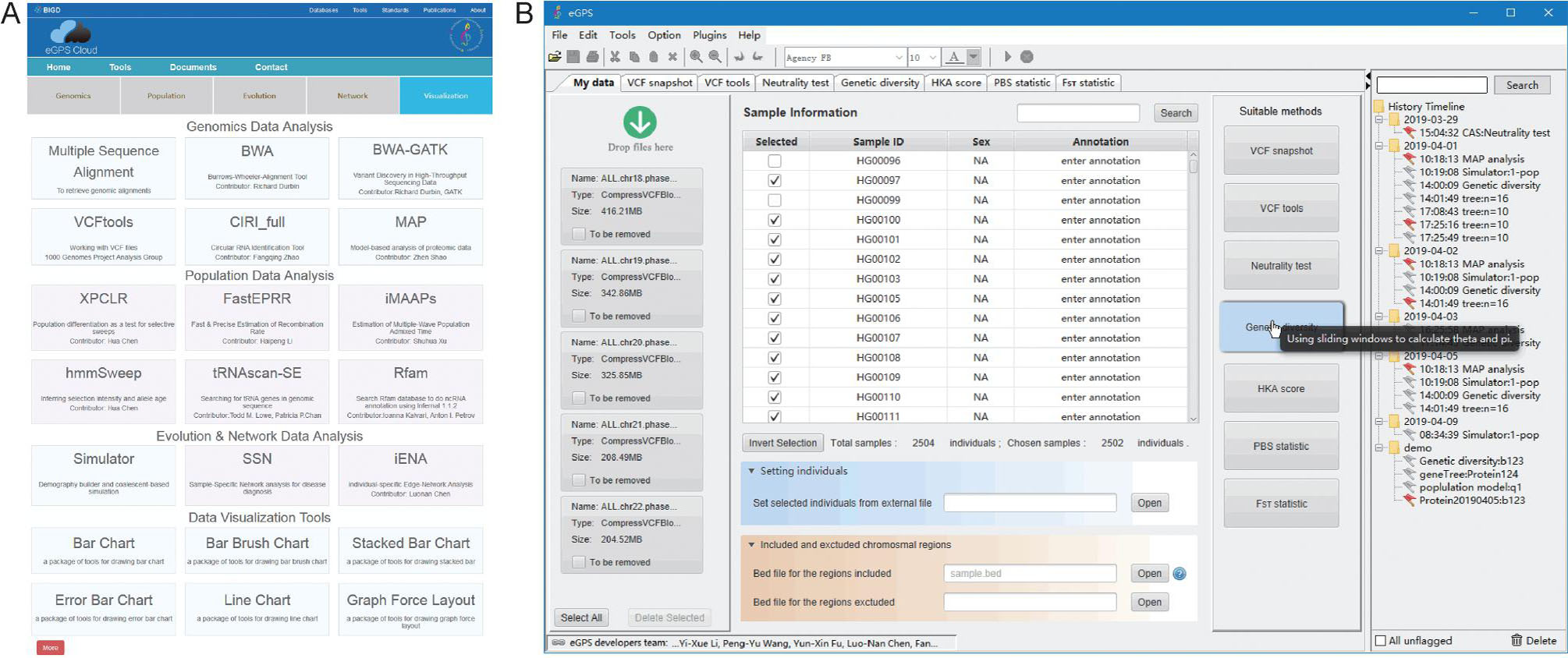 eGPS軟件包括單機軟件版本eGPS Desktop和云計算eGPS Cloud,能夠在不同平臺下運行,且利于開發,易于應用。通過eGPS Cloud,將基因組分析、群體數據分析、進化數據分析、網絡分析以及圖形可視化這五部分的分析有機整合起來,實現遠程云計算功能,方便用戶在缺乏計算資源的情況下快速獲得運算結果,并最終以圖形、圖表等形式直觀展示。通過eGPS Desktop,在無須上傳數據的情況下,用戶可以分析基因組學、轉錄組學和蛋白質組學的數據。同時eGPS Desktop還擁有完善的進化分析流程。比如可以直接從基因組序列比對建立物種樹。在eGPS Cloud和其他開放式在線資源的支持下,eGPS Desktop提供了一鍵點擊從候選基因到基因樹的分析流程。