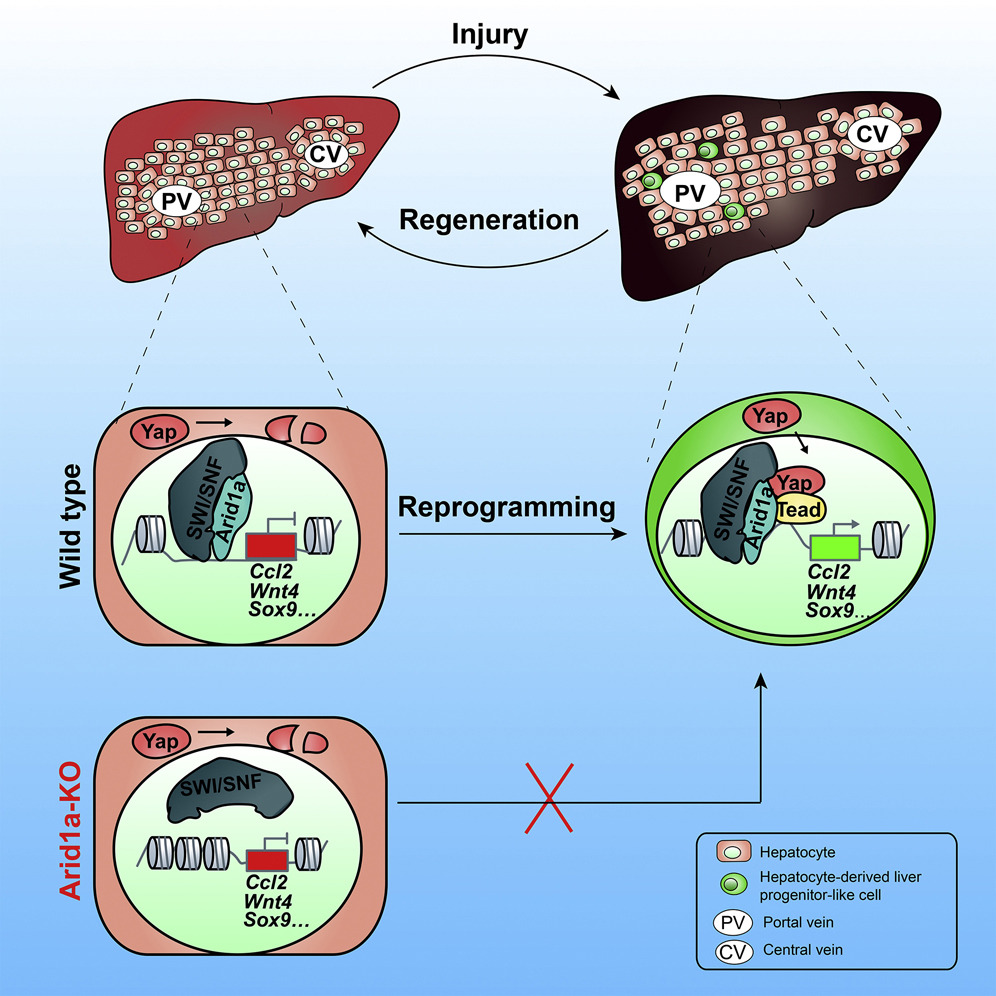 2019年7月3日,國際著名學術期刊Cell Stem Cell在線發表了題為“A Homeostatic Arid1a-Dependent Permissive Chromatin State Licenses Hepatocyte Responsiveness to Liver-Injury-Associated YAP Signaling”的研究論文。該研究由中國科學院分子細胞科學卓越創新中心惠利健研究組與中國科學院上海營養與健康研究所李亦學研究組合作完成。該研究發現染色體重塑調控蛋白Arid1a介導肝細胞重編程基因在正常的肝細胞中預打開,使肝細胞具有響應損傷誘導的YAP信號而轉錄激活重編程基因的潛能,揭示了肝細胞去分化可塑性的分子基礎。