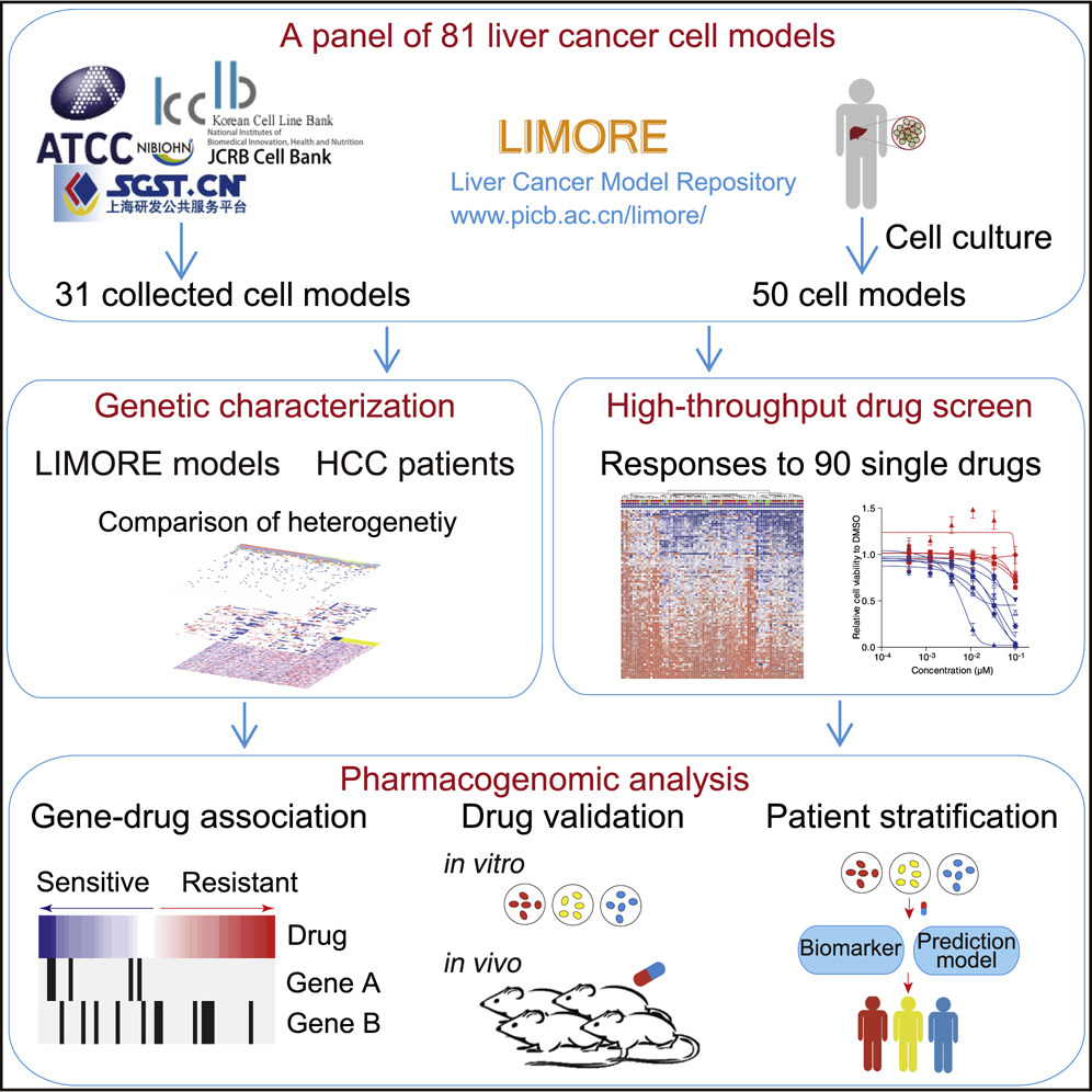 2019年8月1日,國際著名學術期刊Cancer Cell在線發表了中國科學院生物化學與細胞生物學研究所惠利健研究組、中國科學院上海營養與健康研究所李亦學研究組、第二軍醫大學附屬東方肝膽外科醫院張海斌研究組以及南京大學醫學院附屬鼓樓醫院施曉雷合作的題為“A Pharmacogenomic Landscape in Human Liver Cancers”的研究論文。該工作報道了目前最大的肝癌細胞模型平臺和最詳細的肝癌細胞藥物基因組學。通過整合大規模測序和高通量藥物篩選數據,研究人員建立了肝癌中基因組變異與藥物響應的相關性,發現了新的治療靶點和分子標志物(圖1)。