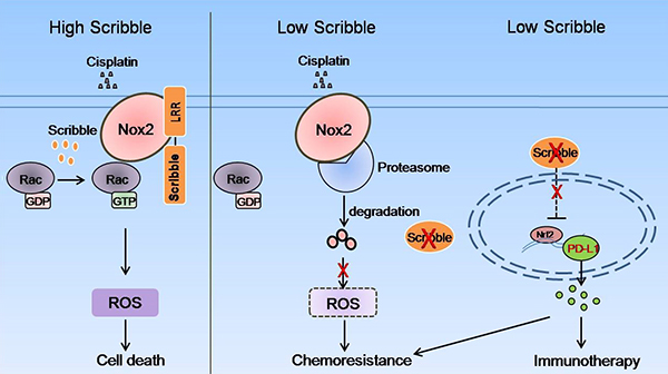 詹麗杏研究組的研究人員利用臨床收集的115例NSCLC患者的化療前腫瘤組織樣本,分析Scribble蛋白水平與鉑類藥物化療預后的相關性;并在另外72例NSCLC患者腫瘤組織樣本中驗證了Scribble蛋白水平與鉑類藥物化療預后正相關。進一步證明了Scribble功能異常顯著降低了順鉑敏感性。體外分子機制研究發現,Scribble與Nox2在細胞膜上共定位,而且Scribble通過LRR結構域與Nox2相互結合并增強Nox2蛋白穩定性。在順鉑處理的NSCLC細胞中,Scribble對Nox2蛋白的穩定有利于ROS的大量產生進而促進細胞凋亡,增強順鉑敏感性。Nrf2(Nuclear factor, erythroid 2 like 2)是ROS產生的重要調節因子;在黑色素瘤中Nrf2上調PD-L1表達且PD-L1促進肺癌化療耐藥產生。我們利用數據庫分析和Kras肺癌模型小鼠,發現在NSCLC組織樣本和耐藥細胞株中,Scribble與NRF2/PDL-1顯著負相關。體外研究發現,Scribble通過抑制Nrf2轉錄進而降低PD-L1水平,而且Scribble對Nrf2/PD-L1的負向調控部分依賴Scribble/Nox2/ROS信號通路。我們的研究發現了Scribble調控NSCLC順鉑化療敏感性的作用和機制,并提出Scribble高表達的NSCLC患者在鉑類藥物化療中預后較好,而Scribble低表達的NSCLC患者應更傾向于選擇基于PD-L1/PD-1免疫抑制劑的免疫治療,為實現NSCLC的個性化治療提供靶標。