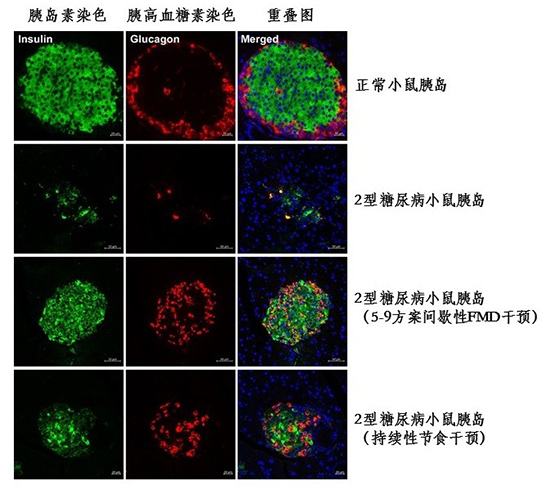 圖示:4組小鼠的胰島免疫熒光染色,可以看出2型糖尿病小鼠的胰島β細胞數量顯著降低,而在間歇性節食干預之后明顯增加。
