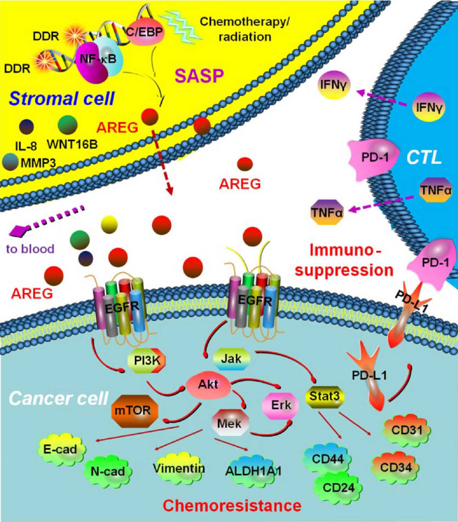 圖注:微環境中的基質細胞在化療損傷背景下進入衰老狀態并合成、釋放SASP外泌因子AREG,導致癌細胞獲得性耐藥并形成免疫抑制性微環境,最終加速疾病惡化進程。