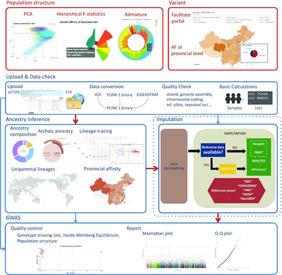 經過多年的努力和積累,徐書華研究組聯合多家研究單位,促成10萬人漢族基因組計劃(The Han100K Initiative)的啟動和實施。Han100K計劃的成員單位和合作者可以通過鏈接(https://www.hanchinesegenomes.org/HCGD/about)查詢,并且處于持續更新中。作為該計劃一期成果,漢族基因組數據庫及在線分析平臺(PGG.Han)肩負著重要使命。PGG.Han是目前唯一針對漢族人群的、也是最大規模的、集數據存儲、發布與在線分析為一體的參考基因組數據平臺。當前上線的PGG.Han版本主要基于對早前基因組數據的收集和分析整理,更專注于提供平臺和構架,為后期持續納入的高質量深度測序數據奠定基礎。目前PGG.Han的漢族樣本在地理分布上共覆蓋了33個省級行政地區及部分海外漢族群體。PGG.Han不僅提供了漢族人群的精細人群遺傳結構圖譜和可視化等位基因頻率地圖,更重要的是還整合了三個實用性強的在線分析工具;包括祖源推斷(AncestryInference),基因型填補(Genotype Imputation)和全基因組關聯分析(GWAS)。這些分析流程由徐書華研究組設計與開發,由生物醫學大數據中心進行軟件封裝,并首次提供免費公開訪問和使用。用戶可以上傳自己的樣本數據,充分利用數據庫中存儲的漢族自然人群參考數據集進行在線分析,最終得到可供下載的分析報告。所有上傳數據均受到嚴格的保護,同時考慮了非計算生物學背景人員的可操作性,并在持續改善用戶體驗。目前正力圖通過廣泛合作持續納入更多高質量深度測序數據,以及提升該數據庫所依賴的高性能計算分析能力。