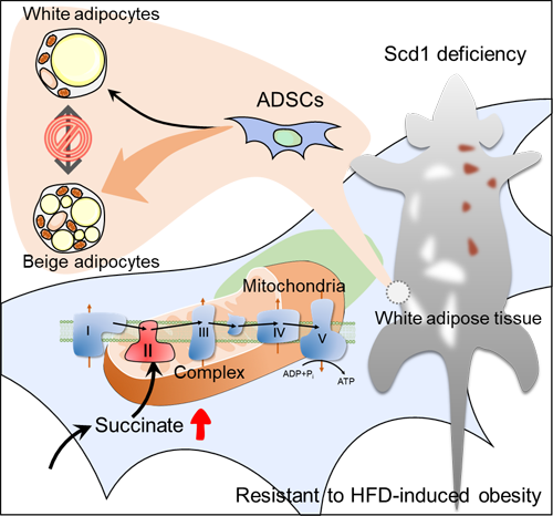 圖注:Scd1缺失導(dǎo)致脂肪前體細胞(ADSCs)內(nèi)琥珀酸含量升高,進而促進線粒體復(fù)合物2活性,使得ADSCs更傾向于米色脂肪細胞分化,以此導(dǎo)致小鼠體內(nèi)米色脂肪大量累積并抵抗高脂飲食誘導(dǎo)的肥胖發(fā)生。