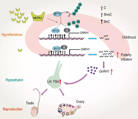 圖1. MKRN3-MBD3-TET2調節哺乳動物青春期時間模型
