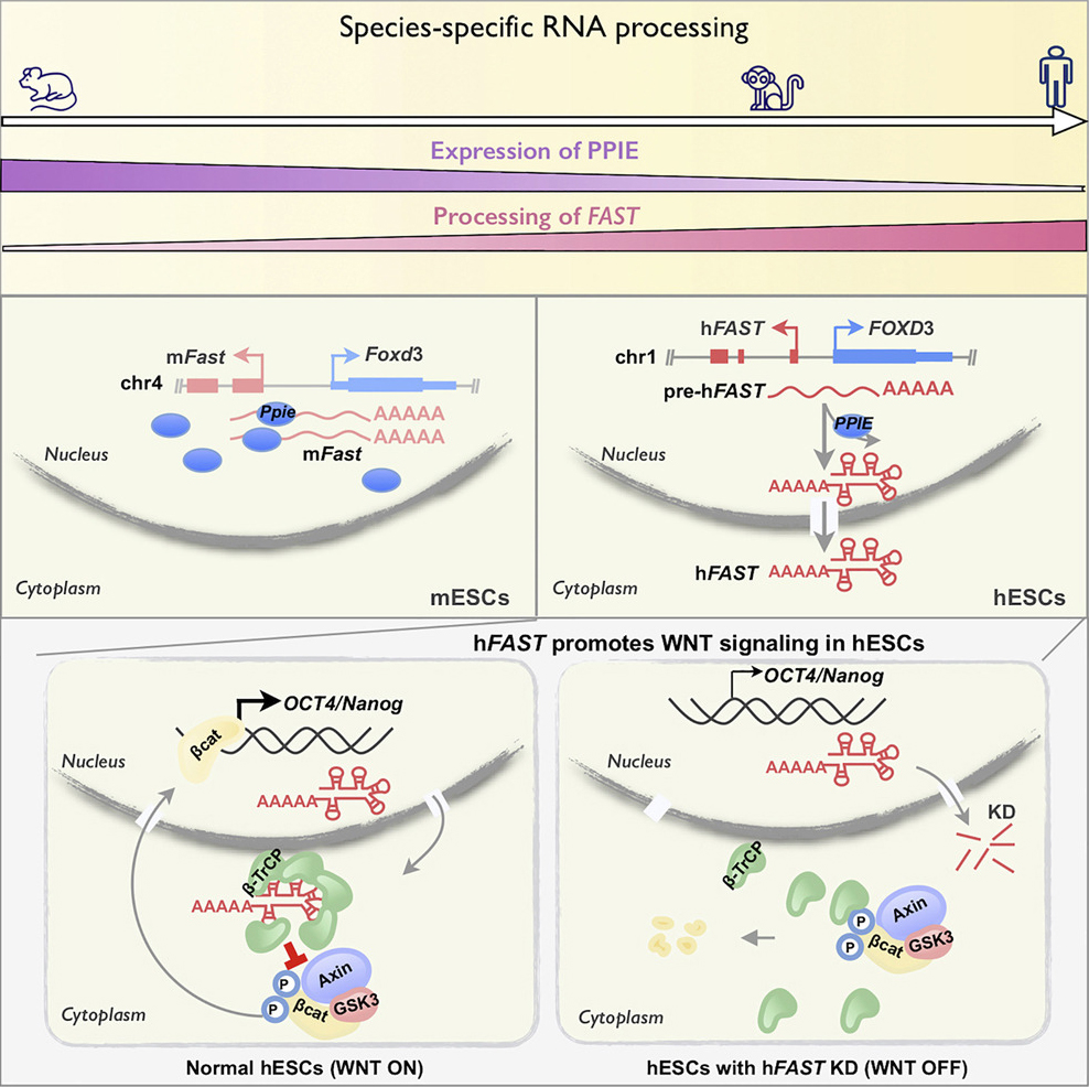 在這項研究中,科研人員基于細胞核和細胞質分離的人、鼠胚胎干細胞來源的高通量測序數據,針對序列及基因組位置保守的一類長非編碼RNA進行了加工及亞細胞定位分析,發現人胚胎干細胞中長非編碼RNA更多地定位于細胞質,而小鼠胚胎干細胞中長非編碼RNA則更多地滯留于細胞核。實驗上進一步證明了人、鼠不同亞細胞定位的長非編碼RNA具有不同功能并詳細解析了其中一個新型的長非編碼RNA——hFAST維持人胚胎干細胞自我更新的分子機制。為了進一步探究長非編碼RNA在不同物種間加工定位差異的分子機制,研究人員結合生物信息學分析預測和實驗驗證篩選到了調控它們不同定位的關鍵因子PPIE。分析發現在鼠、猴、人胚胎干細胞中PPIE表達成下降趨勢,而長非編碼RNA加工水平則成上升趨勢,且長非編碼RNA在人胚胎干細胞中更加傾向定位在細胞質中。深入實驗分析進一步證明了PPIE蛋白對長非編碼RNA(包括FAST)的剪接加工及亞細胞定位的調控作用。上述研究首次揭示了非保守的RNA加工和定位對長非編碼RNA功能發揮的重要作用,從而提示長非編碼RNA的姿態萬千可能是物種特異性的調控和適應的一個重要機理,為物種差異長非編碼RNA的研究提供了新基礎和新思路。