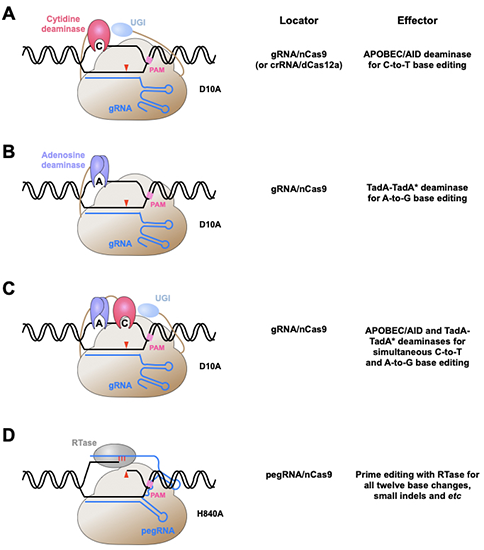 Figure 1. Cas9nickase作為locator和核酸脫氨編輯酶或逆轉錄酶作為effector相結合構成一系列高效的基因組新型堿基編輯系統。