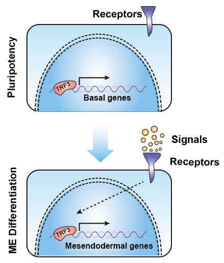 圖示:通用轉錄因子TRF3可以特異性調節hESCs向中內胚層分化。ME: mesendoderm。