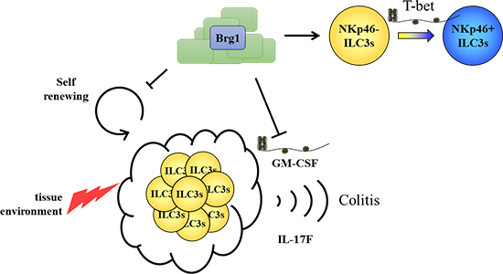 圖. Brg1促進NKp46+ILC3s的分化,并通過抑制ILC3表達GM-CSF從而抑制腸道炎癥。