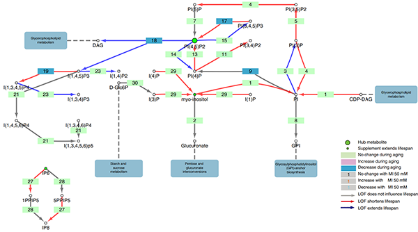 圖1:線蟲myo-inositol的代謝通路圖。每個圓圈表示一個代謝物。每個方格指代一個酶,用數(shù)字代替。列出的代謝物和酶均是線蟲中存在的。絳紅色方格表示該步反應的酶在衰老過程中mRNA水平上升,藍色方格反之。紅色箭頭指示減少該代謝物縮短線蟲壽命,藍色箭頭反之(本圖只標注p < 0.05的數(shù)據(jù))。