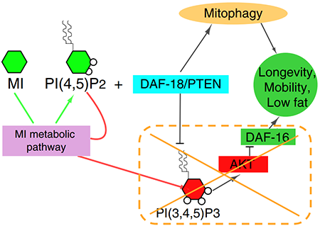 該研究進一步發(fā)現(xiàn),myo-inositol延緩衰老依賴于其代謝通路中的另一個酶,daf-18(Pten),該基因有多種功能,研究最多的是其作為抑癌基因的功能。但研究者發(fā)現(xiàn)myo-inositol主要通過daf-18(Pten)提高線粒體自噬的功能實現(xiàn)延緩衰老的效應。