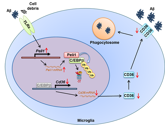 在先前的研究中,肖意傳研究組的科研人員發現Peli1在小膠質細胞中特異性高表達,并介導調節自身免疫性神經炎癥、帕金森氏病(Parkinson's Disease, PD)和病毒性腦炎的發生發展。本研究進一步明確了Peli1在另一種常見神經退行性疾病AD中通過負調控小膠質細胞對Aβ的吞噬能力,致使腦部大量Aβ沉積無法被清除,從而造成AD病情惡化的病理機制。機制研究表明,Peli1直接結合并介導轉錄因子C/EBPβ的泛素化及降解,由于C/EBPβ是清道夫受體CD36的關鍵轉錄因子,故Peli1敲除后顯著促進了CD36基因的表達,由此增強了小膠質細胞對Aβ的吞噬作用。因此,在老年Peli1基因缺失的5×FAD轉基因AD模型小鼠腦內,小膠質細胞對Aβ的清除作用顯著增強,由此抑制了Aβ在腦部的沉積。此外,在5×FAD小鼠腦部小膠質細胞和AD病人腦組織中,Peli1的表達較正常對照明顯升高,提示AD病理會誘導小膠質細胞中Peli1的表達。因此,小膠質細胞中Peli1是AD診治的一個潛在新分子靶標。
