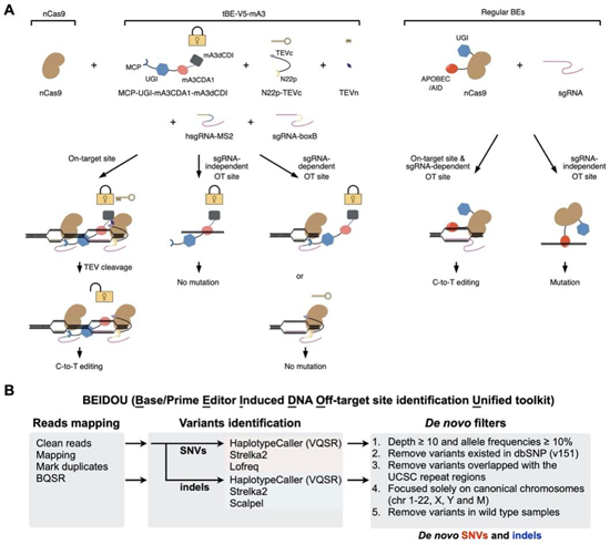 圖示:(A) tBE作用的原理示意圖。以tBE-V5–mA3為例,其可在靶位點去除dCDI產生高效編輯效果,但在OTss和OTsg位點時由于dCDI的存在可以抑制非靶向突變。(B) BEIDOU計算分析流程評估堿基編輯的潛在全基因組水平脫靶。