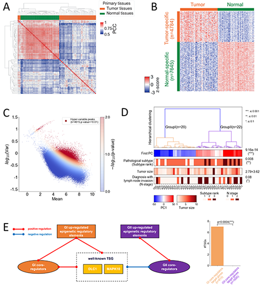 圖:(A)肺腺癌病人腫瘤組織表現出更高的表觀異質性。(B)MAnorm2鑒定的腫瘤和瘤旁正常組織之間差異H3K27ac修飾位點。(C)鑒定病人腫瘤組織間顯著高差異的H3K27ac位點。(D)基于病人腫瘤表觀異質性將42例肺腺癌病人分為病理顯著不同的兩個亞組。(E)兩個亞組各自特異的核心調控因子和表觀調控元件對抑癌基因的差異調控作用。