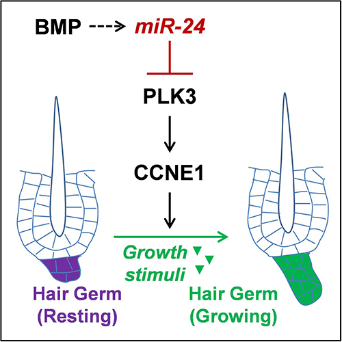 研究人員發(fā)現(xiàn),在毛囊由靜止到激活轉(zhuǎn)變過(guò)程中,即將激活的毛囊前體細(xì)胞顯著下調(diào)了一個(gè)miRNA,miR-24。通過(guò)構(gòu)建和分析miR-24的皮膚上皮特異性誘導(dǎo)過(guò)表達(dá)和條件性敲除小鼠模型,研究人員發(fā)現(xiàn)miR-24的作用是限制毛囊前體細(xì)胞對(duì)生長(zhǎng)刺激的敏感性。miR-24在皮膚上皮組織中的過(guò)表達(dá)顯著延緩了毛囊前體細(xì)胞的激活與毛發(fā)周期推進(jìn),而它在皮膚上皮組織中的條件性敲除顯著加速了毛發(fā)周期,并提高了毛囊對(duì)毛發(fā)再生刺激的敏感性。值得一提的是,miR-24的皮膚條件性敲除能夠顯著提高米諾地爾(minoxidil)生發(fā)水的生發(fā)效果,且無(wú)可見(jiàn)副作用,提示miR-24具有作為新型生發(fā)治療靶點(diǎn)的潛力。從機(jī)制上講,研究人員發(fā)現(xiàn)Plk3是一個(gè)新的miR-24的靶基因,它通過(guò)調(diào)控參與細(xì)胞周期的關(guān)鍵蛋白CCNE1在miR-24的激活限制功能中發(fā)揮主要作用。此外,研究人員還發(fā)現(xiàn),miR-24作用于已知的毛發(fā)生長(zhǎng)抑制信號(hào)BMP的下游。