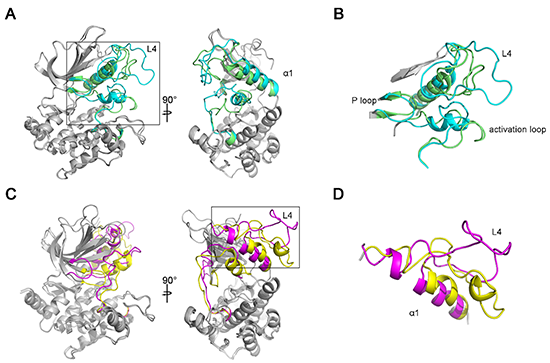圖:新插入外顯子編碼的Loop(L4)以及相鄰的、受到加速進(jìn)化影響的P-loop和activation loop的NRK蛋白質(zhì)結(jié)構(gòu)。