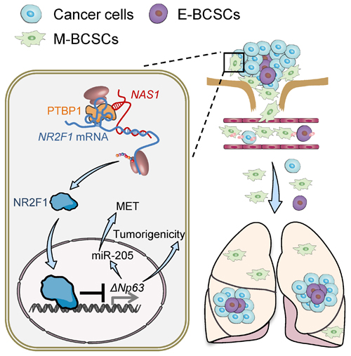 此項(xiàng)研究發(fā)現(xiàn),M-BCSC相較E-BCSC具有更強(qiáng)的從原位瘤向外播散的能力,但是播散到肺部的E-BCSC更容易快速形成轉(zhuǎn)移灶而M-BCSC則傾向于在肺部休眠。通過轉(zhuǎn)錄組測(cè)序分析發(fā)現(xiàn),長(zhǎng)鏈非編碼RNA NR2F1-AS1在休眠的M-BCSC中上調(diào)。功能研究表明NR2F1-AS1能夠通過促進(jìn)腫瘤細(xì)胞的EMT提升乳腺腫瘤細(xì)胞的M-BCSC特征從而促進(jìn)原位腫瘤細(xì)胞向外播散,同時(shí)NR2F1-AS1能夠抑制播散到肺部腫瘤細(xì)胞的E-BCSC特征從而抑制腫瘤細(xì)胞在肺部的再激活,最終促進(jìn)乳腺癌細(xì)胞的轉(zhuǎn)移休眠。病人來源的腫瘤樣本分析也證實(shí)NR2F1-AS1與腫瘤細(xì)胞干性特征和轉(zhuǎn)移休眠存在明顯的相關(guān)性。
