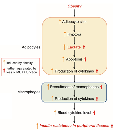 陳雁研究組對脂肪細胞高表達的單羧酸轉運蛋白MCT1進行研究,這是體內最主要的乳酸轉運蛋白。通過構建了脂肪組織特異性敲除MCT1的小鼠、以及利用細胞水平上的研究,發現脂肪組織中MCT1主要介導細胞乳酸的外排。敲除MCT1的小鼠在高脂飲食誘導的肥胖模型中不會顯著影響體重,但是小鼠發生了更嚴重的胰島素抵抗。對該表型進一步的研究發現,敲除MCT1會導致脂肪組織的促炎巨噬細胞的浸潤增加,最終導致肥胖小鼠發生嚴重的系統性炎癥。分子機制研究發現,MCT1敲除導致脂肪細胞中乳酸累積增加,脂肪細胞的凋亡信號被激活,并影響到脂肪細胞分泌的炎性細胞因子。分泌的炎癥因子募集了巨噬細胞并通過巨噬細胞進一步放大了炎癥信號,最終加重全身的胰島素抵抗。