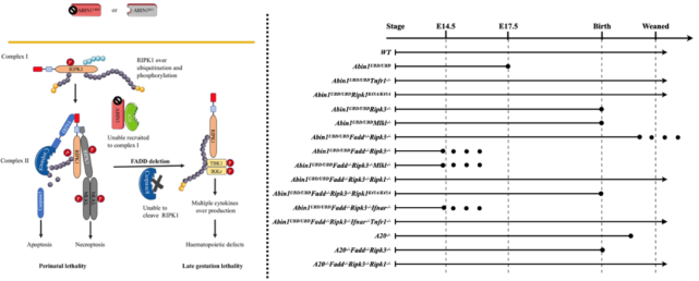 綜上所述,該研究揭示了泛素結合蛋白ABIN1調控RIPK1激活依賴的細胞凋亡和細胞程序性壞死的關鍵分子機制,同時通過構建十幾種多基因敲除小鼠遺傳模型證實了不同死亡信號通路與炎癥信號通路之間的互作調控關系,為通過調控不同細胞死亡方式及炎癥反應通路治療相關疾病提供了理論基礎和新思路。