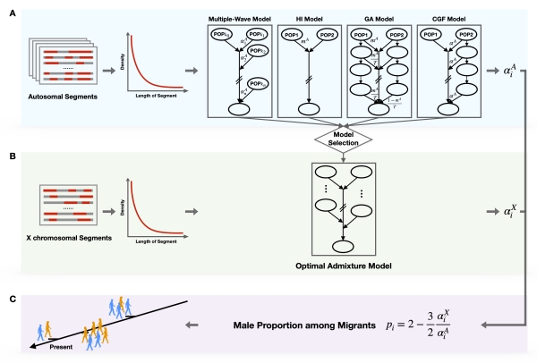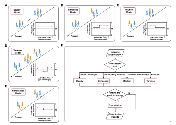 性別偏向性實(shí)際上廣泛存在于人群基因交流過(guò)程中,即特定祖源的男女遺傳貢獻(xiàn)存在差異。非裔美國(guó)人(African Americans)和拉丁裔美洲人(Hispanic Americans or Latino American)為學(xué)界熟知的存在性別偏向性混合的人群。性別偏向性混合的研究對(duì)了解人群形成和演化歷程、理解現(xiàn)代人類遺傳差異、以及指導(dǎo)醫(yī)學(xué)研究都有重要的理論意義和應(yīng)用價(jià)值。然而,受限于分析方法,人群演化歷史上錯(cuò)綜復(fù)雜的基因交流中存在的性別偏向性長(zhǎng)期以來(lái)未得到充分研究,特別是一些經(jīng)歷過(guò)多次而復(fù)雜基因交流歷史的人群,曾經(jīng)發(fā)生的不同方向的性別偏向混合往往被忽視。MultiWaverX的提出在很大程度上為這些問(wèn)題的解決提供了新方法和新思路。