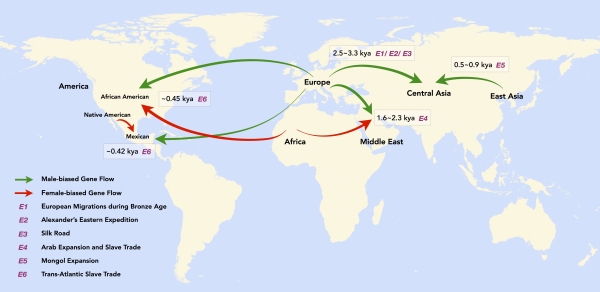 圖 3. 現(xiàn)代人類演化歷史上性別偏向性混合模式示意圖