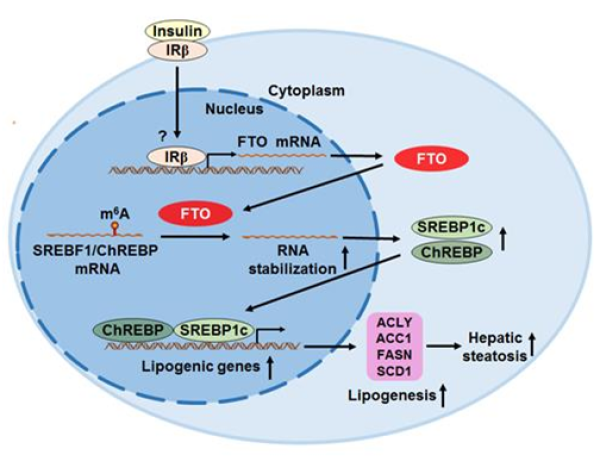 注:胰島素刺激肝細胞后,FTO的表達增加。FTO可以通過m6A去甲基化來穩定SREBF1和ChREBP的mRNA,從而導致其蛋白質水平增加,最終促進了肝臟脂肪生成,導致肝臟脂肪變性。