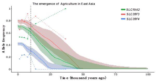 維生素B1的一個重要功能是促進碳水化合物的代謝。為了驗證在東亞地區農業發生后人群飲食結構的改變是否是這種適應性選擇的進化驅動力。該研究通過分析當代人群的基因組數據,并結合不同歷史時期古現代人基因組數據去估計受選擇單倍型在不同歷史時期的頻率。結果發現受到選擇的單倍型在1萬年前已達到了高頻,而在近1萬年內頻率未發生大的改變(圖2)。該分析結果進一步表明適應性進化在1萬年前已經完成。這可能也提示農業發生后人群飲食結構的改變并非自然選擇的原初驅動力。