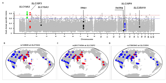 該研究首先依據對3823個全球人群的全基因組測序數據的分析,發現了在維生素B1代謝通路涉及的7個編碼蛋白質的基因中有3個基因(SLC19A2, SLC35F3, SLC35F43)在東亞人群和其他大洲人群有極顯著的差異(圖1);如有些基因單倍型在東亞人群達到極高頻,而在非洲人群中完全缺失,在歐洲人群中缺失或頻率極低,提示這些基因的單倍型在東亞人群中是特異性存在,進一步分析表明這些基因在東亞人群演化歷史中經受過正向自然選擇。