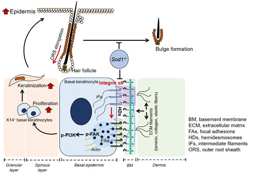 SCD1是催化飽和脂肪酸變為單不飽和脂肪酸的限速酶,該基因的缺失或突變會引起皮膚毛發顯著減少。該研究發現,在毛發生長的周期過程中,Scd1的表達呈周期性變化。當SCD1缺失時,皮膚毛囊處于持續伸長狀態,無論在第一個毛發生長周期還是剃毛誘導毛發生長過程中,均不能呈現經典的hair cycle形態變化,引起毛囊bulge形成障礙,無法為靜息HFSCs提供儲存場所。該研究發現,SCD1缺失引起的毛發減少并不是因為其直接影響HFSCs,也不是因為其調控微環境中的間質細胞、免疫細胞,而是由于K14角質形成細胞中缺失SCD1所造成。當K14角質形成細胞中缺失SCD1時,基底角質形成細胞上整合素(integrin)α6表達顯著下降,引起皮膚半橋粒結構組裝減少,整合素下游FAK-PI3K信號通路過度活化,促進角質形成細胞的增殖和角質化,從而抑制毛囊和外根鞘縮短,無法形成毛囊bulge結構。通過阻斷PI3K過度活化或以油酸糾正SCD1介導的脂肪酸代謝異常,均可以有效地恢復SCD1缺失小鼠的半橋粒結構、毛囊bulge結構、靜息HFSCs和毛發生長。該研究發現了脂肪酸代謝調控HFSCs干細胞龕形成和穩態維持的新機制,為理解毛發生長和皮膚穩態維持提供了重要的理論基礎。