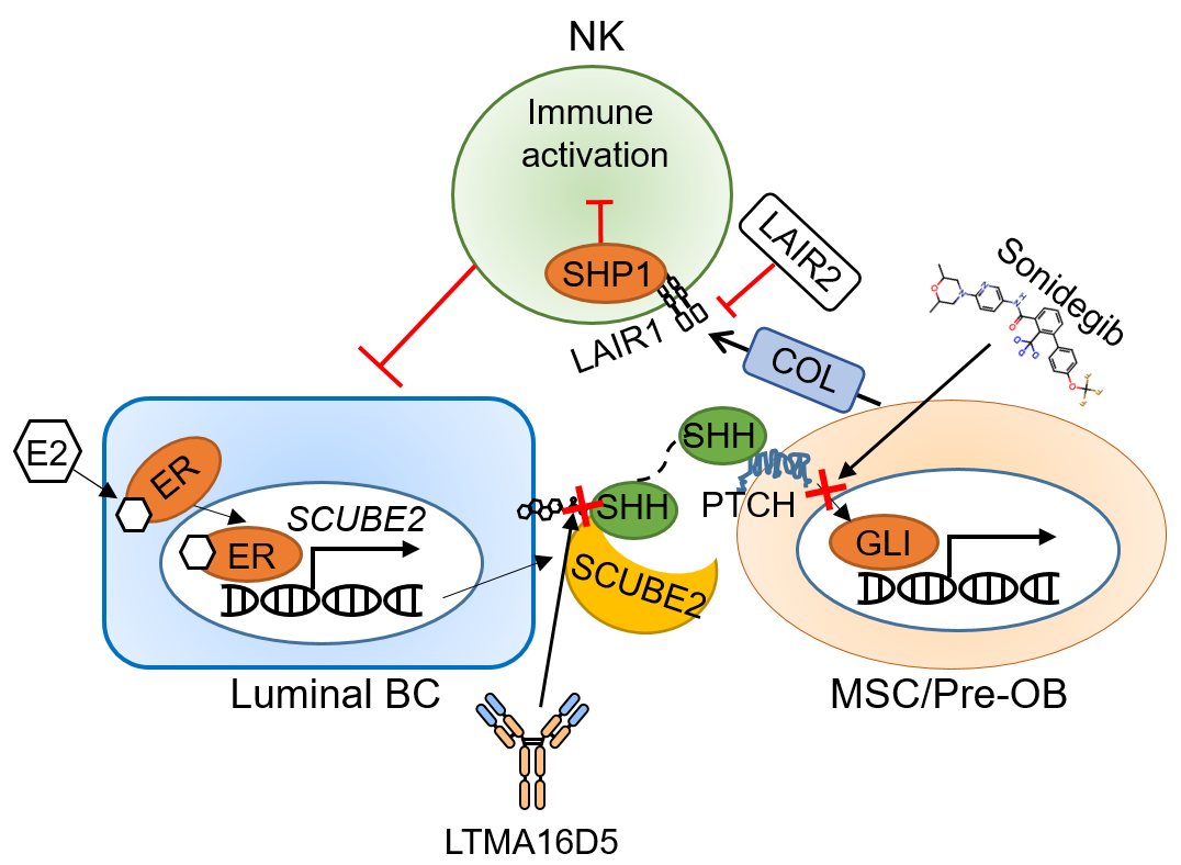 胡國宏研究組發現腫瘤分泌的SCUBE2是介導LBC骨轉移傾向性的重要因子,可作為乳腺癌骨轉移風險的血清學標記和骨轉移治療的新靶點。首先基于大規模公開臨床數據分析,篩選得到在LBC中特異性表達上調的分泌蛋白SCUBE2,并在多種小鼠模型中驗證了SCUBE2對骨轉移的促進功能。機制研究表明SCUBE2受到LBC細胞中特異性激活的ER信號調控,并通過促進腫瘤細胞釋放SHH,激活成骨前體細胞中Hedgehog信號,從而誘導成骨分化。成骨細胞大量釋放COL1,通過COL1-LAIR1-SHP1軸抑制NK細胞的激活,從而解除NK細胞對癌細胞的免疫監視。使用FDA批準的Hedgehog信號抑制劑Sonidegib可以顯著抑制乳腺癌骨轉移的發生。此外,研究組開發了一株SCUBE2中和抗體,該抗體可顯著阻斷SCUBE2的功能,在多個乳腺癌骨轉移模型中均表現出良好的骨轉移治療效果。