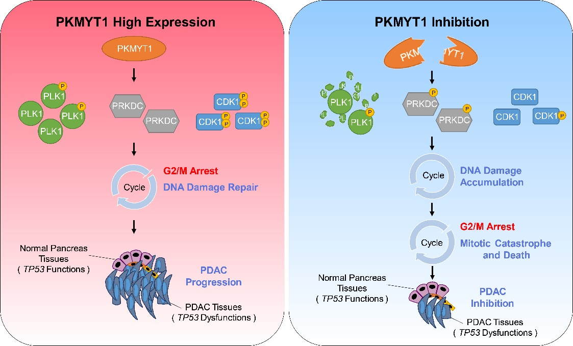 (左):PKMYT1高表達(dá),G2/M期可進(jìn)行DNA損傷修復(fù),癌細(xì)胞持續(xù)增殖。(右):PKMYT1抑制,下游信號改變(PLK1、CDK1、PRKDC等),G2/M檢驗點功能異常,癌細(xì)胞積累大量DNA損傷,導(dǎo)致凋亡。靶向PKMYT1是集有效性和安全性于一體的胰腺癌治療策略