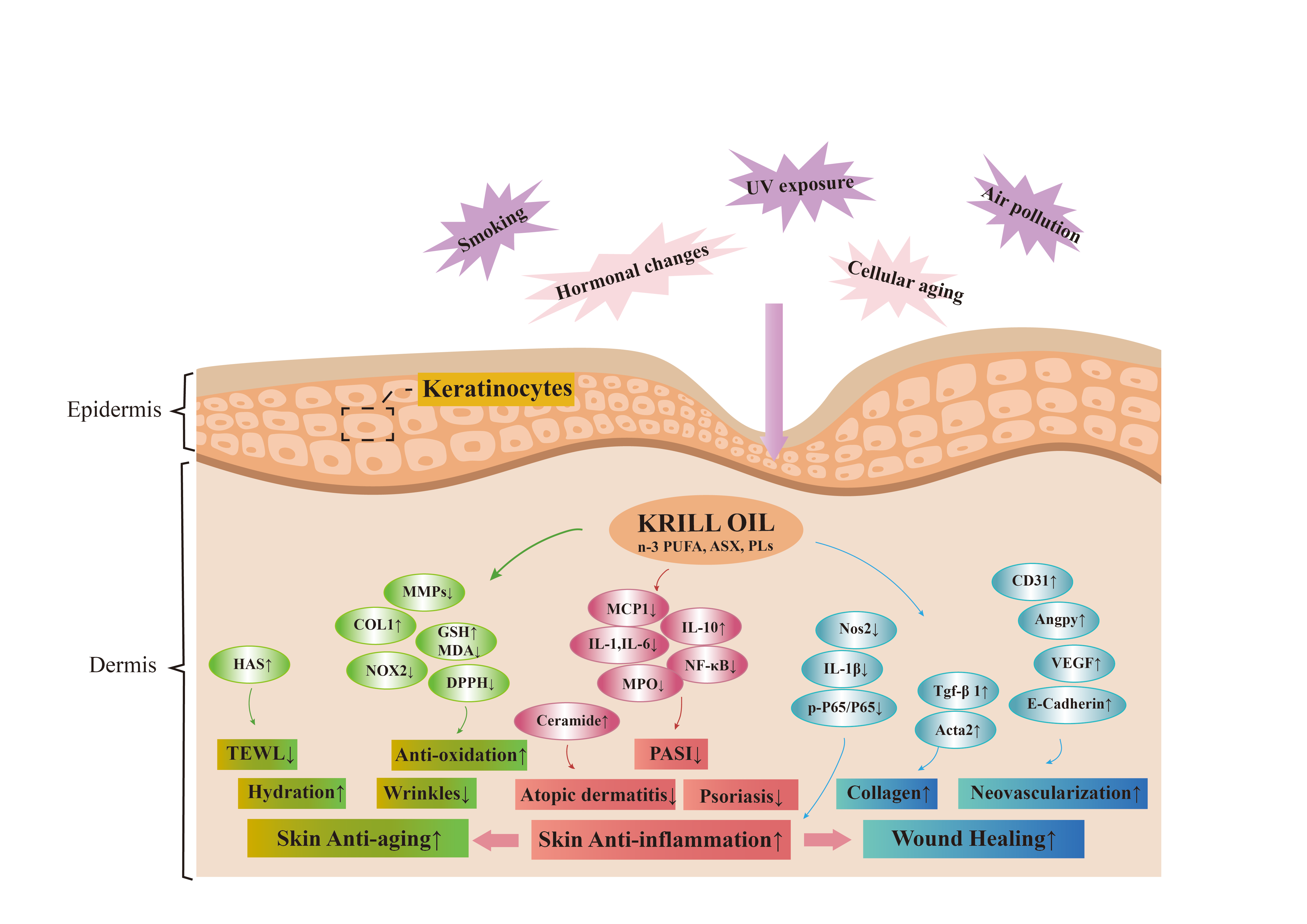 圖:南極磷蝦油在改善皮膚衰老、炎癥和傷口愈合方面的作用與機制