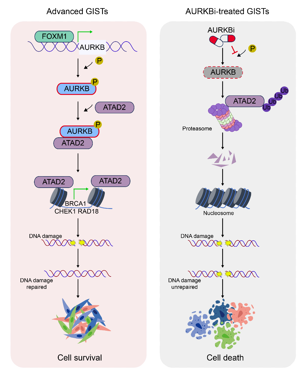 營(yíng)養(yǎng)與健康所博士研究生程裕梅在王躍祥研究員指導(dǎo)下,通過早期/晚期GIST多組學(xué)篩選、CRISPR篩選和高通量化合物篩選三重整合篩選,鑒定出AURKB為不依賴于KIT突變類型的GIST新型治療靶點(diǎn)。發(fā)現(xiàn)AURKB在高危及轉(zhuǎn)移性GIST中顯著高表達(dá),而在低中危腫瘤中幾乎不表達(dá),這種表達(dá)上調(diào)由轉(zhuǎn)錄因子FOXM1直接調(diào)控。AURKB基因敲除顯著抑制了腫瘤細(xì)胞在體外和小鼠體內(nèi)的生長(zhǎng),并誘發(fā)細(xì)胞周期阻滯、衰老和凋亡。機(jī)制研究表明,AURKB通過自身激酶結(jié)構(gòu)域與ATAD2結(jié)合,穩(wěn)定了ATAD2蛋白避免其被多聚泛素化標(biāo)記降解。被穩(wěn)定的ATAD2蛋白通過調(diào)控與DNA損傷修復(fù)相關(guān)基因區(qū)域的染色質(zhì)開放性調(diào)節(jié)基因表達(dá),增加腫瘤細(xì)胞抵抗DNA損傷并穩(wěn)定基因組的能力,進(jìn)而發(fā)揮促癌作用。