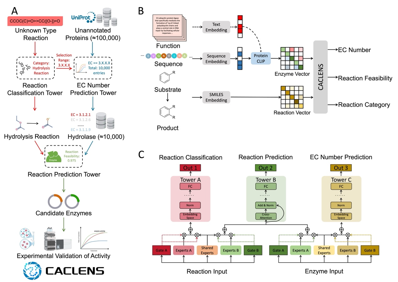 近年來,深度學習在酶的結構、功能與性質的大規模預測領域取得了顯著進展。然而,由于缺乏面向多模態輸入和多任務輸出的統一建模能力,現有方法仍難以滿足高性能功能酶篩選的需求。針對這一挑戰,研究團隊設計并開發了CACLENS (Cross-Attention & Contrastive Learning-enabled Enzyme Selection)框架,將CGCCustomized Gate Control控機制、對比學習與交叉注意力等方法深度融合,構建可同時執行多項預測任務的一體化酶篩選平臺。