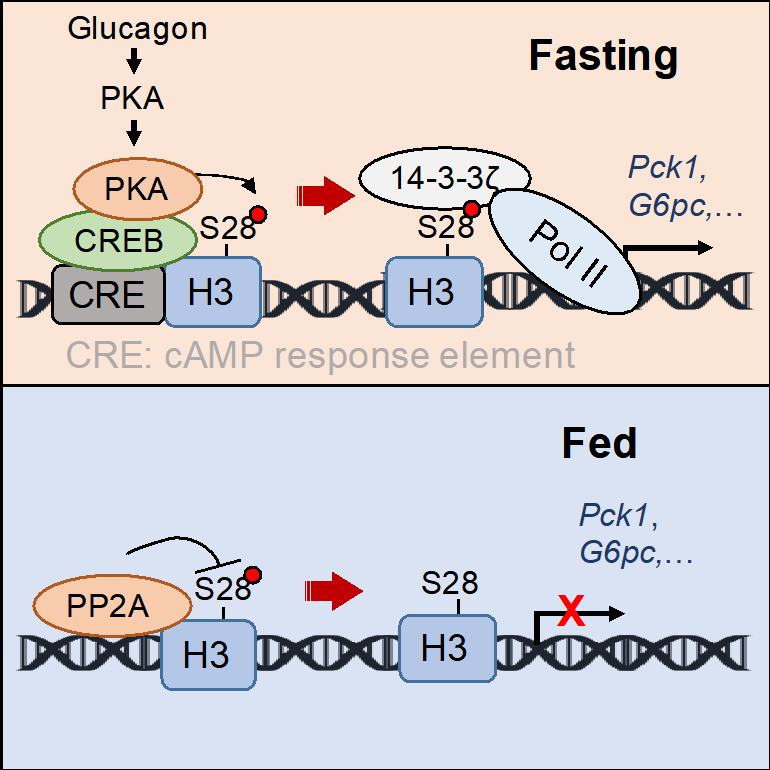 圖示. 在饑餓情況,血液內胰高血糖素上升并與肝臟上受體結合,促進肝臟細胞內cAMP上升。PKA被激活并釋放出催化亞基,與基因組上的CREB結合后促進H3S28ph。14-3-3 作為表觀閱讀器識別H3S28ph并招募RNA聚合酶II激活糖異生基因轉錄。相反地,PP2A是H3S28ph磷酸酶并抑制糖異生基因表達。