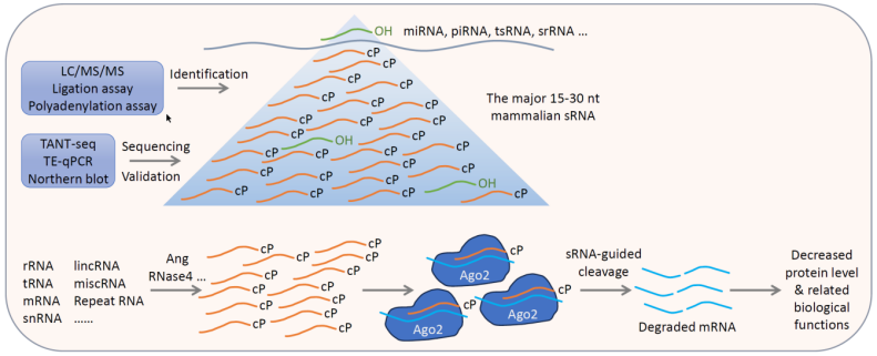 哺乳動物15-30nt長度的小RNA主要為sRNA-cP,但這些小RNA究竟是在分離純化RNA過程中隨機降解產(chǎn)生的,還是在細胞內(nèi)特異性加工產(chǎn)生的還有待解答。通過對sRNA-cP的末端序列特征分析發(fā)現(xiàn),其3’末端主要為嘧啶堿基,而5’末端主要為嘌呤堿基。根據(jù)已知的細胞內(nèi)各種RNA內(nèi)切酶的序列識別特征,通過逐步的體外篩選以及后續(xù)的基因敲除和過表達等技術(shù)發(fā)現(xiàn),ANG和RNase4介導了部分sRNA-cP的產(chǎn)生。